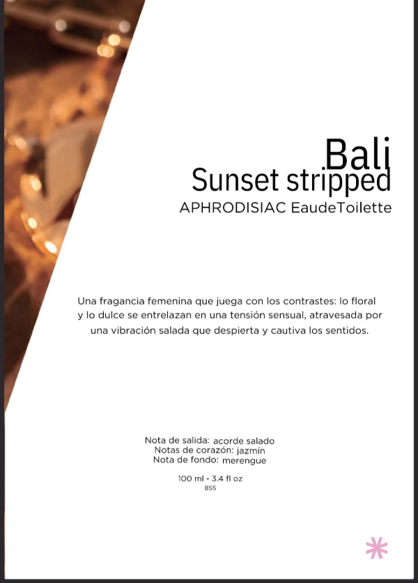 Déjate envolver por la tensión fluida entre lo floral y lo dulce, atravesada por una sutil vibración salada. Bali Sunset Stripped captura la esencia de un atardecer tropical con una combinación de notas saladas en la salida, un corazón de jazmín sensual y un fondo de merengue irresistible.